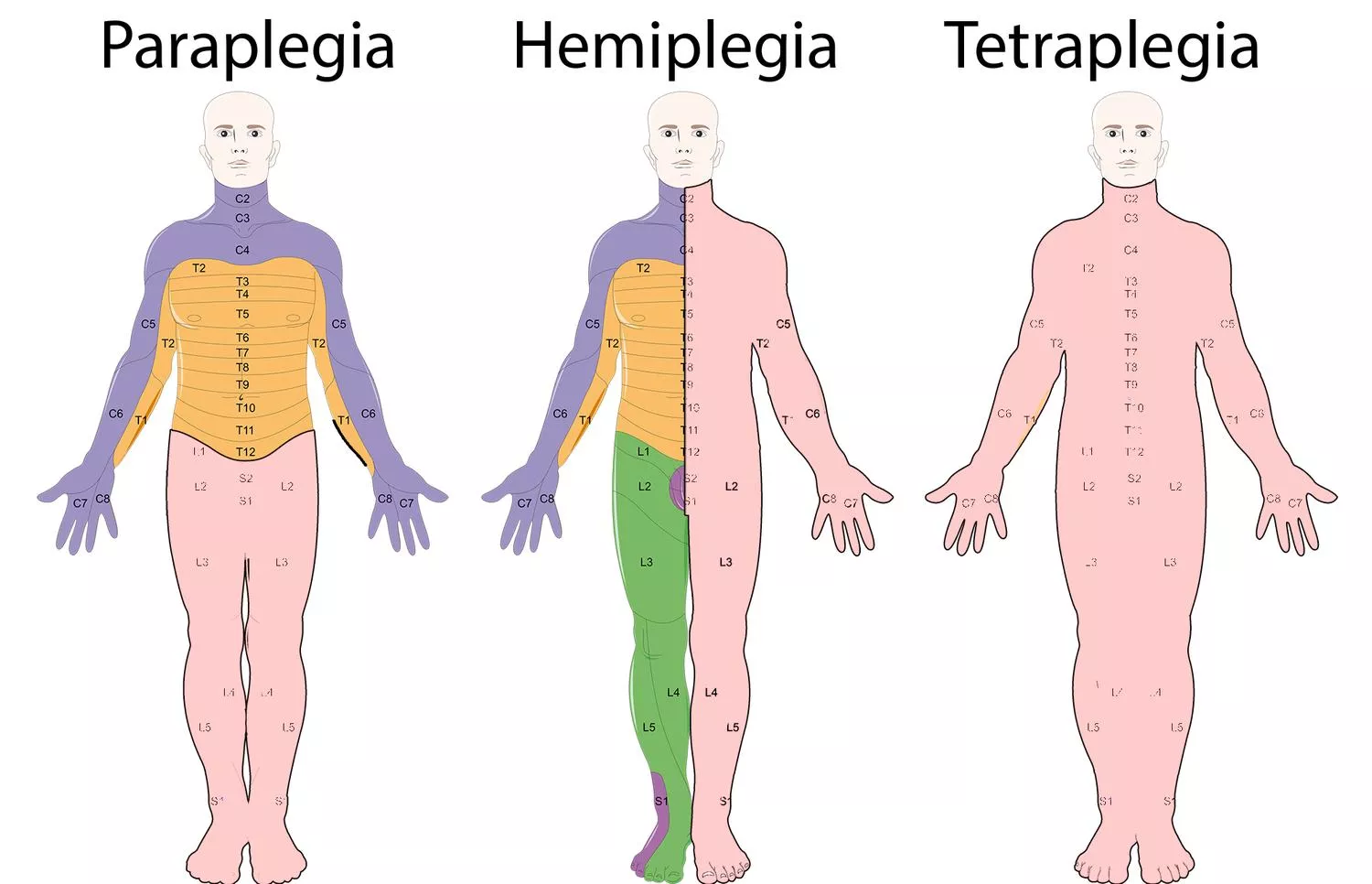 A paraplegia, hemiplegia és tetraplegia sematikusan. A pontos kiterjedés változhat a neurológiai sérülés függvényében. Ritkán az érintett testtájon bizonyos szenzoros és/vagy motoros funkciók fennmaradhatnak.